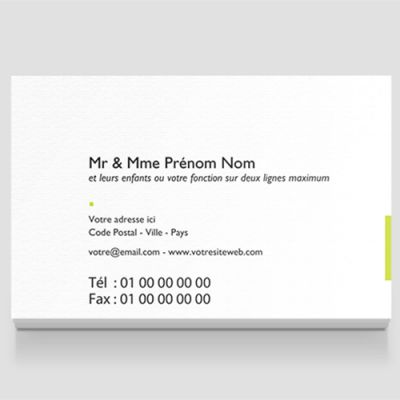 Votre carte de visite grand format, ou carte de visite familiale, accueillera toutes vos informations de contact. Au format 8,2 x 12,8 cm, la carte de visite grand format peut également vous servir de carte de remerciement ou même de carte de correspondance. Imprimée sur du papier 300g, votre carte de visite grand format véhiculera une image haut de gamme grâce à une impression de qualité. Choisissez parmi nos nombreux modèles de cartes de visite grand format en ligne et ajoutez-y le logo ou l'image de votre choix. Sur Ooprint.fr vous avez également la possibilité d'opter pour une carte de viste grand format vierge et de télécharger votre propre création pour un modèle unique et orignal. Pour votre carte de visite vierge grand format vous pourrez choisir entre une impression recto ou recto/verso.